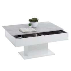Dieser Wohnzimmertisch besteht aus strapazierfähiger, melaminbeschichteter Spanplatte in edlem Betongrau mit weißen Elementen, die zu jedem Einrichtungsstil passen.