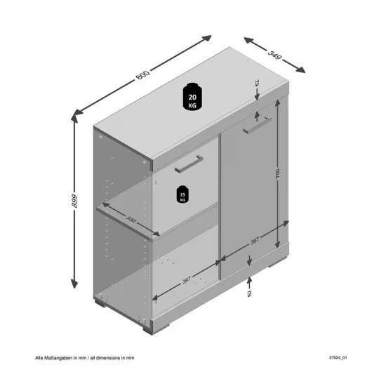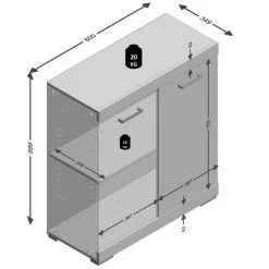 Caractéristiques produit : Meuble livré en kit. A monter soi-même Fabriqué en Allemagne Fabriqué en panneaux de particules mélaminés, offrant une bonne résistance à l’abrasion, aux rayures et aux taches Label PEFC : panneaux de particules fabriqués avec du bois provenant de forêts gérées durablement Temps de montage indicatif: 20 minutesDimensions produit : Largeur 80 cm x Hauteur 89,9 cm x Profondeur 34,9 cm – Poids net 23,5 kg Dimensions colis : Colis n°1 : Longueur 99,6 cm x Largeur 46 cm x Hauteur 12,6 cm – Poids brut 25,964558016 kg