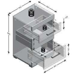 - Jedes Fach kann ein Gewicht von bis zu 3 kg tragen (Tischplatte bis zu 25 kg)