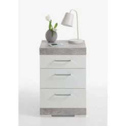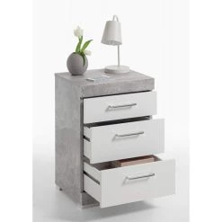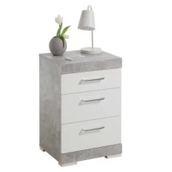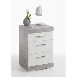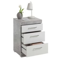 Der stilvolle Nachttisch von FMD besteht aus strapazierfähiger, melaminharzbeschichteter Spanplatte in dezentem betongrauen Farbelementen, die zu fast jedem Einrichtungsstil passen.