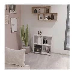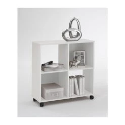 Das zeitgemäße freistehende Regal von FMD ist eine vielseitige Aufbewahrungsmöglichkeit bestehend aus 4 gleich großen Fächern auf zwei Ebenen! Sie können es für die Aufbewahrung von Dokumenten im Büro verwenden, da Sie Ihre Akten dank der schwenkbaren Rollen während der Arbeit immer in Ihrer Nähe haben können oder Sie können es mit Ihren Lieblingsbüchern und Schmuckstücken auffüllen. Das stilvolle mobile Regal besteht aus melaminbeschichteter Spanplatte in dezentem Weiß, die zu fast jedem Einrichtungsstil passt.