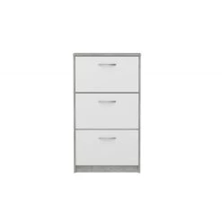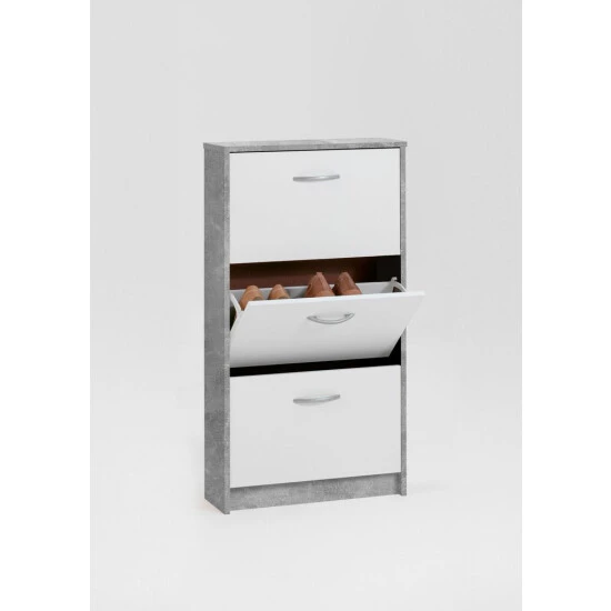 Praktischer Schuhkipper in Light Atelier beton /weiß. mit weisser Front mit Platz für bis zu 6 Paar Schuhe inkl. 3 Klappwalzen zum Herunterklappen und öffnen der Türchen.