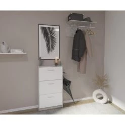 Dieser Schuhschrank von FMD ist aus haltbarer, melaninbeschichteter Spanplatte hergestellt und kommt in weiß-betongrauer Farbe daher. Somit fügt er sich perfekt in die verschiedensten Einrichtungsstile ein.